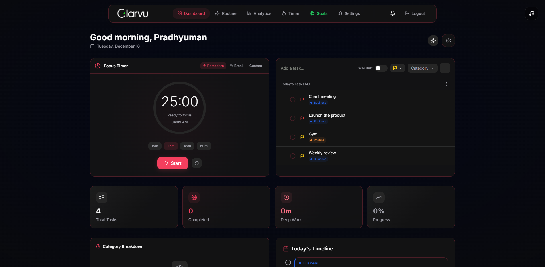 Clarvu helps business owners track focus, cut wasted time, and improve consistently — without micromanaging their day.